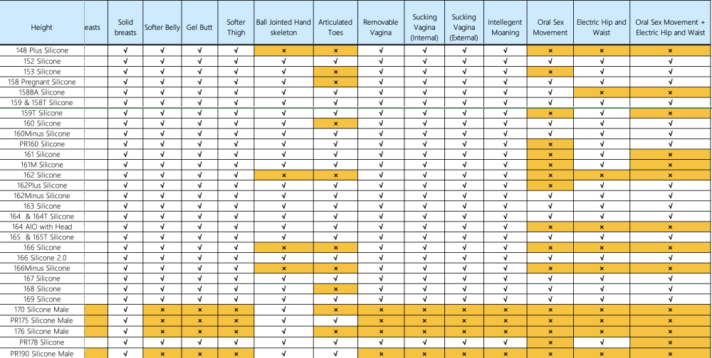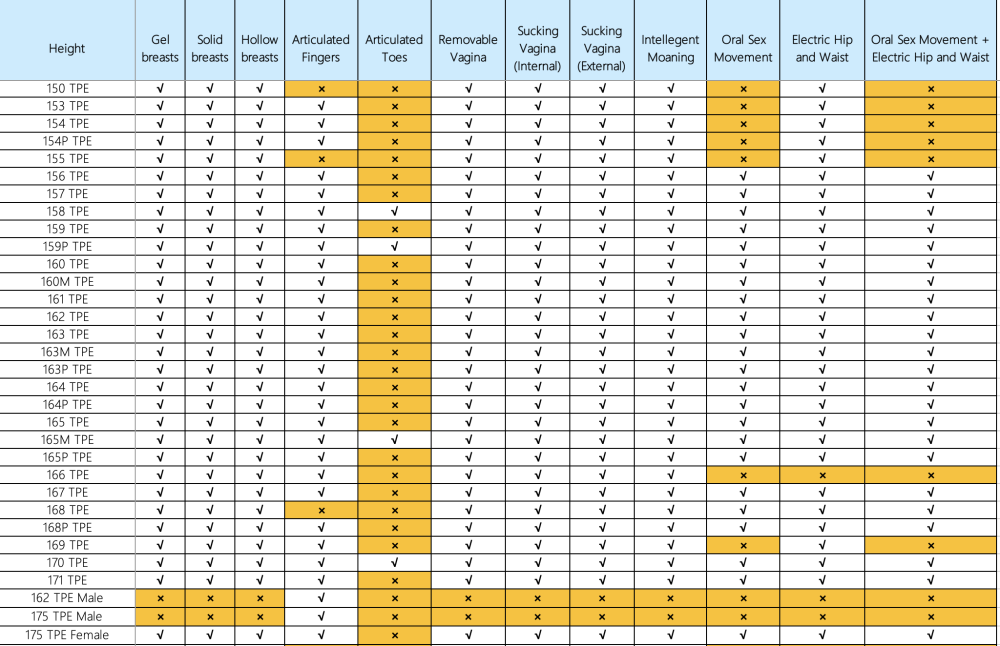 Before learning various functions of Irontech TPE and silicone dolls, let's check the charts to see whether the functions you choose are available for your preferred body type.
